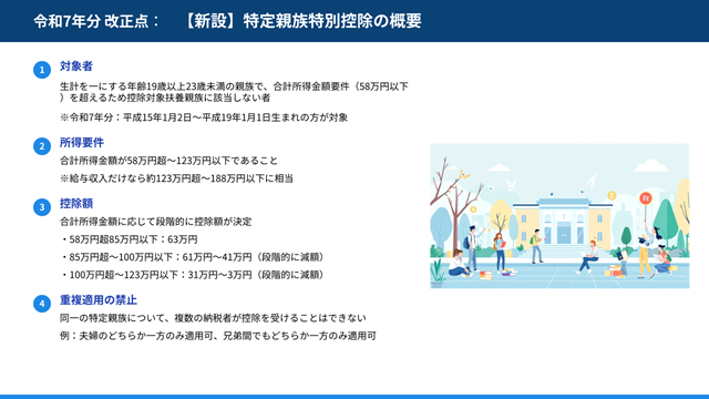 今回の説明会で特に力を入れてお話ししたのが、「特定親族特別控除」の創設です。これは、いわゆる「年収の壁」問題への対応として新たに設けられた控除制度です。